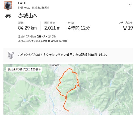 という事で距離84km、獲得2000mUPの赤城山ヒルクライムの試走ライドが終了。ペース配分、コースレイアウトの確認など、本番に向けて良い練習になったかなと。9月の大会まではまだ期間があるのでまた来る事にしよう。