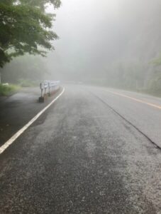 まあこれくらいならいいかなと思って走っていた所、上るにつれて路面はウェットになっていき、ある程度走ると小雨も振り出して路面は完全にウェットな状況に・・・。おまけに霧?が出ていたようで見晴らしも少々良くない感じ。