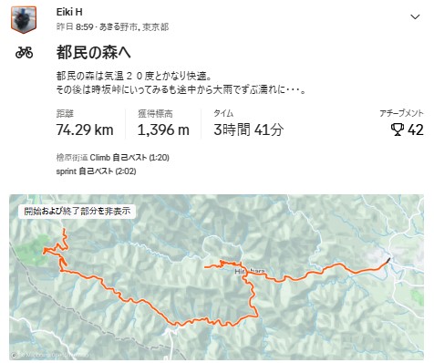 ↑にしても都民の森のルートは距離が長い!STRAVAのセグメントでは距離が約20kmという事で、なかなかこの距離を上るルートを普段走る事がないので結構しんどい。
