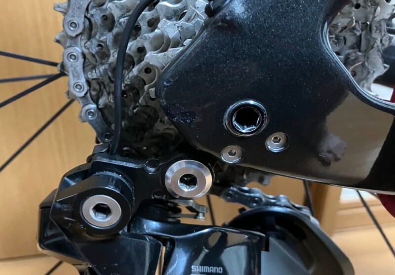↑一番目立つのはフレームエンドのリアディレーラーが付いている辺りの傷で、下地の白い部分が出てしまっている感じ。