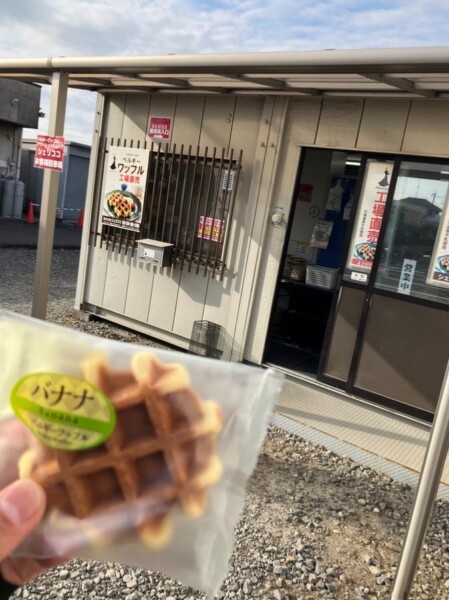 中に入るとベルギーワッフルやカステラなんかもあって、アウトレット価格で販売されているみたい。どれも美味しそうだけどそんなに持てないので、とりあえずバナナ味、ちょこバナナ味、紅芋味のワッフルを3つほどを購入。何と価格は税込みでひとつ100円!