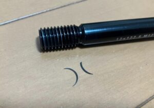 ↑何か引っかかってるのかと思って見てみると、何かがネジ山から落ちたのに気づく。よくよく見るとどうもスルーアクスルのネジ山部分の一部のような・・・。ネジ山の塗装が剥げてしまっていて、恐らくそこの部分が削れてしまったのだと思われる。