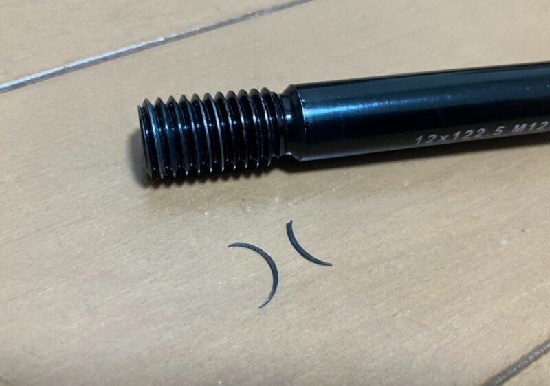 ↑何か引っかかってるのかと思って見てみると、何かがネジ山から落ちたのに気づく。よくよく見るとどうもスルーアクスルのネジ山部分の一部のような・・・。ネジ山の塗装が剥げてしまっていて、恐らくそこの部分が削れてしまったのだと思われる。