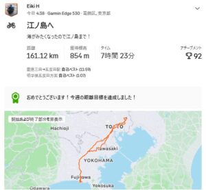 そんな感じで距離160km、850mUPのライドが終了。初めていった江の島はとっても気持ちの良い場所だったので、今後行きやすいルートを再考してまた来たいと思います。
