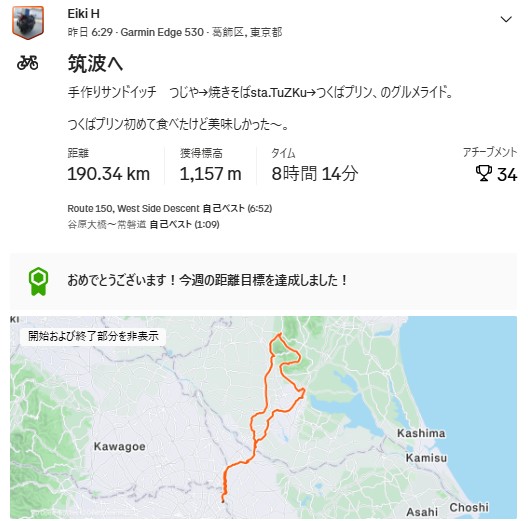 という事で今回の筑波自走&グルメの190kmライドですが、自走で190kmほどとちょっと手軽に!?という距離では無かったたものの、今回の道はそれほど交通量も多くなく随分行きやすい道だったし、ヒルクライム+グルメで満足度が高いライドで素敵な1日となりました~。