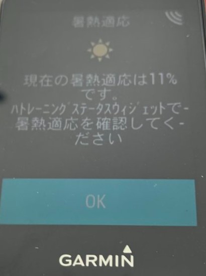 ↑ライド終了後、サイコンからは「暑熱適応11%」の表示が!?それほど今日は暑かったのだなと実感。まさか4月にこの表示を目にする事になるとは・・・。